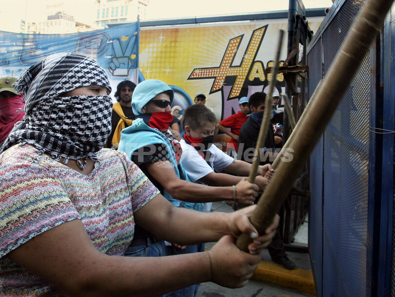 【ブエノスアイレス/アルゼンチン 10日 AFP】ジョージ・W・ブッシュ(George W.Bush)米大統領の中南米歴訪に反対を唱える一団が9日、アルゼンチンの首都ブエノスアイレス(Buenos Aires)の米国商業会議所の前で暴徒化し、警官隊と衝突した。ブッシュ大統領は、各地で抗議活動が繰り広げられるなか、9日からブラジル、ウルグアイ、コロンビア、グアテマラ、およびメキシコの歴訪を開始している。一方、アルゼンチンを訪問中のベネズエラのウゴ・チャベス(Hugo Chavez)大統領は、「反米国帝国主義」を掲げて集会を行った。写真は9日、ブエノスアイレス市内で警官に物を投げる暴徒。(c)AFP/DANIEL GARCIA