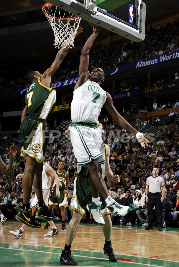 【ボストン/米国 9日 AFP】06-07NBA、ボストン・セルティックス(Boston Celtics)vsシアトル・スーパーソニックス(Seattle SuperSonics)。セルティックスのアル・ジェファーソン(Al Jefferson)は、ゲームハイの31得点16リバウンドで4試合連続となるダブルダブルを記録し、チームの勝利に貢献した。試合はセルティックスがスーパーソニックスに最大15点のリードを奪われながらも118-103で勝利を収め、今季18勝目を挙げた。写真は、スーパーソニックスのラシャード・ルイス(Rashard Lewis)を振り切りダンクを決めるジェファーソン。(c)AFP/Getty Images/NBAE Brian Babineau