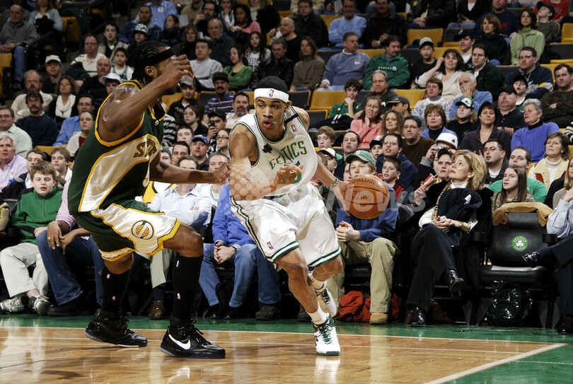 【ボストン/米国 9日 AFP】06-07NBA、ボストン・セルティックス(Boston Celtics)vsシアトル・スーパーソニックス(Seattle SuperSonics)。セルティックスのアル・ジェファーソン(Al Jefferson)は、ゲームハイの31得点16リバウンドで4試合連続となるダブルダブルを記録し、チームの勝利に貢献した。試合はセルティックスがスーパーソニックスに最大15点のリードを奪われながらも118-103で勝利を収め、今季18勝目を挙げた。写真は、スーパーソニックスのラシャード・ルイス(Rashard Lewis)を振り切りダンクを決めるジェファーソン。(c)AFP/Getty Images/NBAE Brian Babineau