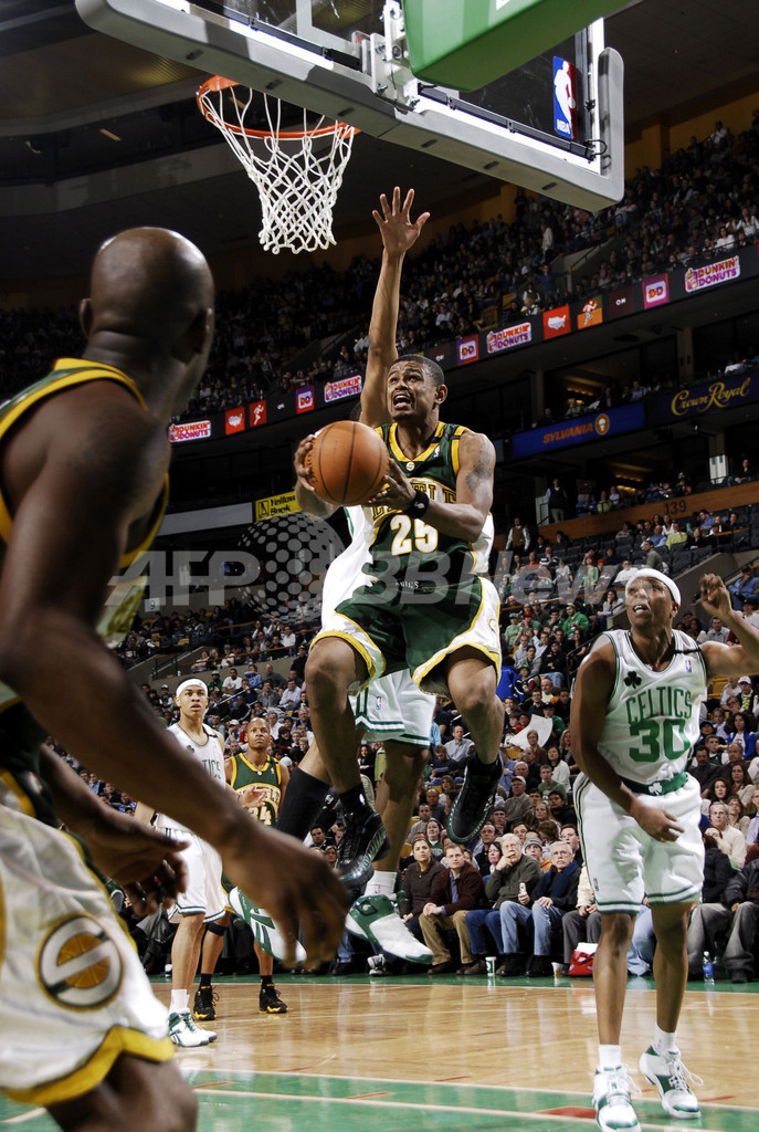 【ボストン/米国 9日 AFP】06-07NBA、ボストン・セルティックス(Boston Celtics)vsシアトル・スーパーソニックス(Seattle SuperSonics)。セルティックスのアル・ジェファーソン(Al Jefferson)は、ゲームハイの31得点16リバウンドで4試合連続となるダブルダブルを記録し、チームの勝利に貢献した。試合はセルティックスがスーパーソニックスに最大15点のリードを奪われながらも118-103で勝利を収め、今季18勝目を挙げた。写真は、スーパーソニックスのラシャード・ルイス(Rashard Lewis)を振り切りダンクを決めるジェファーソン。(c)AFP/Getty Images/NBAE Brian Babineau