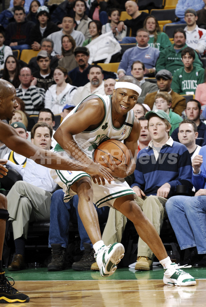 【ボストン/米国 9日 AFP】06-07NBA、ボストン・セルティックス(Boston Celtics)vsシアトル・スーパーソニックス(Seattle SuperSonics)。セルティックスのアル・ジェファーソン(Al Jefferson)は、ゲームハイの31得点16リバウンドで4試合連続となるダブルダブルを記録し、チームの勝利に貢献した。試合はセルティックスがスーパーソニックスに最大15点のリードを奪われながらも118-103で勝利を収め、今季18勝目を挙げた。写真は、スーパーソニックスのラシャード・ルイス(Rashard Lewis)を振り切りダンクを決めるジェファーソン。(c)AFP/Getty Images/NBAE Brian Babineau