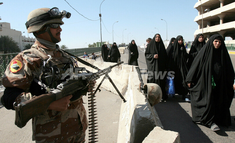 写真は同日、バグダッドの厳重警戒区域、グリーンゾーンで警備にあたるイラク兵。(c)AFP/ALI AL-SAADI