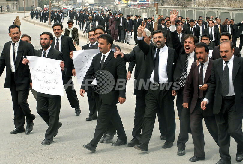 【クエッタ/パキスタン 10日 AFP】ペルベズ・ムシャラフ(Pervez Musharraf)大統領は9日、イフティカル・ムハンマド・チョードリー(Iftikhar Muhammad Chaudhry)最高裁判所長官(58)を不正行為や職権乱用などを理由に解任した。チョードリー氏は2005年6月に最高裁判所長官に任命されたが、資格を持たない息子が警察で勤務できるよう手配したとの容疑で訴えられている。写真はクエッタ(Quetta)で10日、チョードリー氏の解任に抗議する弁護士ら。(c)AFP/Banaras KHAN