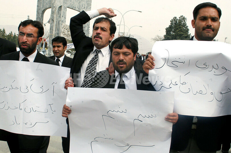 【クエッタ/パキスタン 10日 AFP】ペルベズ・ムシャラフ(Pervez Musharraf)大統領は9日、イフティカル・ムハンマド・チョードリー(Iftikhar Muhammad Chaudhry)最高裁判所長官(58)を不正行為や職権乱用などを理由に解任した。チョードリー氏は2005年6月に最高裁判所長官に任命されたが、資格を持たない息子が警察で勤務できるよう手配したとの容疑で訴えられている。写真はクエッタ(Quetta)で10日、チョードリー氏の解任に抗議する弁護士ら。(c)AFP/Banaras KHAN