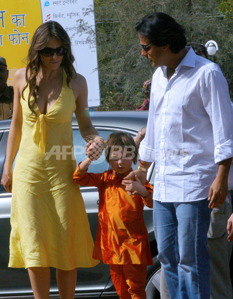 【ジョドプール/インド 10日 AFP】9日に西部ラジャスタン州ジョドプール市内のUmaid Bhawanホテルでヒンズー教式の結婚式を挙げた英国人モデルで女優のエリザベス・ハーレー(Elizabeth Hurley)とインド人事業家アルン・ナヤー(Arun Nayar)氏は挙式から一夜明けた10日、ムンバイへと向かった。『Big Fat Indian Wedding』と地元メディアから形容された盛大な結婚式は、この豪華イベントの様子を一瞬でもカメラに収めようとした取材陣と警備にあたっていた警官や護衛の小競り合いで幕を閉じた。取材に当たっていたAFPカメラマンはこの衝突で最低10人の負傷者が出たと話した。写真は、ジョドプール空港(Jodhpur Airport)に到着した(左から)ハーレーと息子のダミアン(Damian)君、ナヤー氏。(c)AFP/RAVEENDRAN