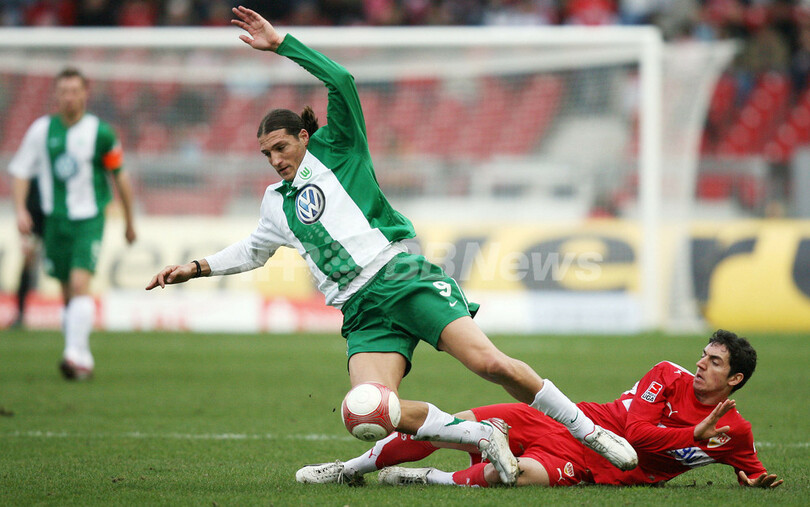 【シュツットガルト/ドイツ 10日 AFP】サッカー、ドイツ・ブンデスリーガ・第25節、シュツットガルト(Stuttgart)vsVfLボルフスブルク(VfL Wolfsburg)。試合はスコアレスドローに終わり、両チームは勝ち点1を分け合った。写真は、ボルフスブルクのホナタン・サンタナ(Jonathan Santana、右)と競り合うシュツットガルトのマテュー・デルピエール(Matthieu Delpierre)。(c)AFP/OLIVER LANG
