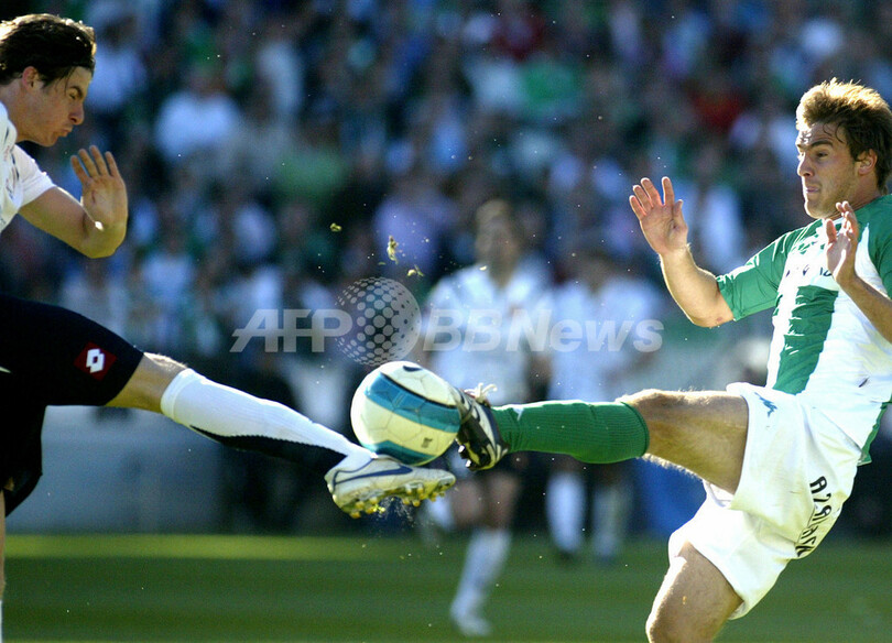 【セビリア/スペイン 11日 AFP】サッカー、スペイン・リーガエスパニョーラ1部・第26節、ベティス(Betis)vsサラゴサ(Zaragoza)。試合は1-1のドローに終わり、両チームは勝ち点1を分け合った。写真は、サラゴサのアンヘル・ラフィタ(Angel Lafita、左)を背にボールを受けるベティスのフェルナンド・ベガ(Fernando Vega)。(c)AFP/CRISTINA QUICLER