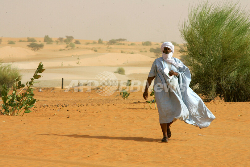 【ヌアクショット/モーリタニア 12日 AFP】モーリタニアでは11日、大統領選挙の投票が行われている。2005年8月、独裁者マーウイヤ・ウルド・アハメド・タヤ(Maaouya Ould Ahmed Taya)元大統領を無血クーデターで打倒した軍事政権は、公約通り民主主義への移行を主導している。2006年11月には議会選挙、2007年1月には上院選挙が実施されており、今回の大統領選挙は19か月間の民主主義移行過程の最終段階に位置づけられている。かつてフランスの植民地だったモーリタニアは1960年に独立して以降、クーデターや軍部による政権掌握などを繰り返している。写真は11日、ヌアクショット(Nouackchott)の北東にある「Route de l’espoir(希望の道)」沿いの村、Ghasremにある投票所に向かう男性。(c)AFP/GEORGES GOBET