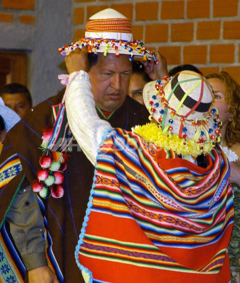 【El Alto/ボリビア 12日 AFP】ウゴ・チャベス(Hugo Chavez)ベネズエラ大統領は11日、訪問先のボリビアで、ジョージ・W・ブッシュ(George W. Bush)米大統領の中南米歴訪について、「歴訪は帝国主義的な行動。大統領が与えるものは“施し”のようなもの」と辛らつに批判した。チャベス大統領は、オイル、ガスなどのエネルギーについて2国間協定を交わすため、ボリビアを訪れていた。写真は同日、ラパス(La Paz)から12キロほど離れたEl Altoで、エボ・モラレス(Evo Morales)大統領と調印を交わす前に、記念の帽子を贈呈されるチャベス大統領。(c) AFP/Javier MAMANI
