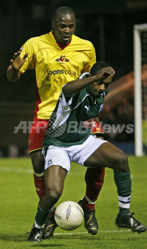 【プリマス/英国 11日 AFP】サッカー、イングランド・FAカップ(FA Cup)・準々決勝、プリマス・アーガイル(FC Plymouth Argyle)vsワトフォード(Watford)。試合は前半21分にアメウル・ブアッザ(Hameur Bouazza)の挙げた得点を守りきったワトフォードが1-0でプリマス・アーガイルを降し、準決勝進出を果たした。写真は、ボールを追うワトフォードのジェイ・ディメリット(Jay DeMerit、右)とプリマス・アーガイルのバリー・ヘイルズ(Barry Hayles、左)。(c)AFP/LEON NEAL