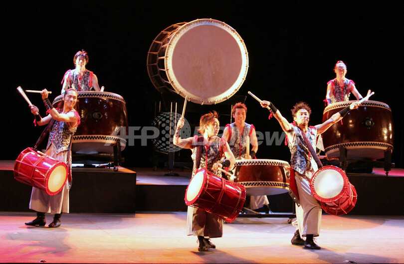 【マナマ/バーレーン 12日 AFP】大阪を拠点に活動する和太鼓グループ「打打打団天鼓(Dadada-Dan Tenko)」が11日、首都マナマ(Manama)のArad Fortで公演を行なった。これは、1日から4月12日まで開催されている「スプリング・オブ・カルチャー2007(Spring of Culture 2007)」フェスティバルに参加したもの。写真は、パフォーマンスを披露する団員たち。(c)AFP/Adam JAN