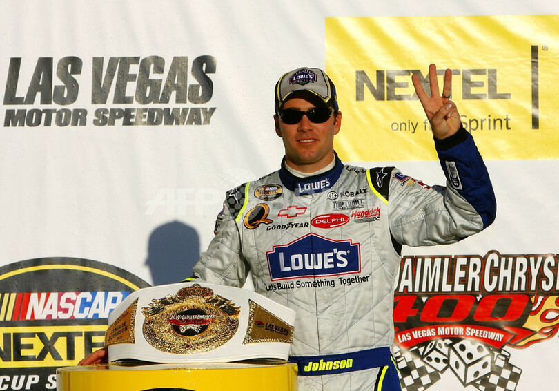 【ラスベガス/米国 11日 AFP】NASCAR・ネクステルカップ・シリーズ(2007 NASCAR Nextel Cup Series)・第3戦・UAWダイムラークライスラー400(UAW-DaimlerChrysler 400)、決勝。23番グリッドからスタートしたヘンドリック・モータースポーツ/シボレー(Hendrick Motorsports Chevrolet)のジミー・ジョンソン(Jimmie Johnson)は、シーズン初優勝を飾り190ポイント(267周)を獲得した。(c)AFP/Getty Images Rusty Jarrett