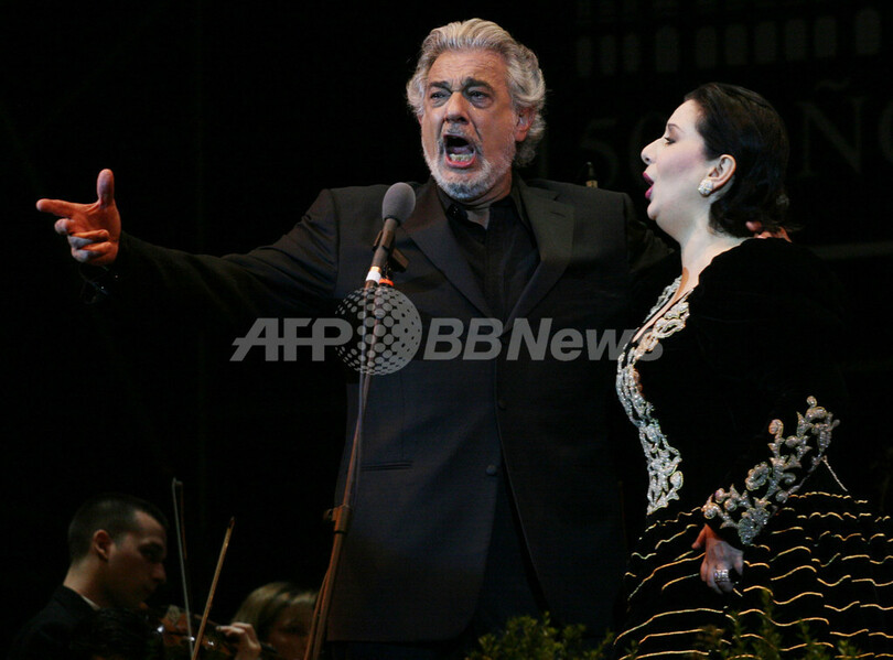 【サンティアゴ/チリ 12日 AFP】Town Council Theatreの新シーズン開幕を記念して11日、Plaza de Armasを会場に、スペイン人テノール歌手のプラシド・ドミンゴ(Placido Domingo)とチリ人ソプラノ歌手ヴェロニカ・ヴィッラロエル(Veronica Villarroel)がオープニング・コンサートを開催した。写真は壇上でパフォーマンスを披露するドミンゴ(左)とヴィッラロエル。(c)AFP/DAVID LILLO