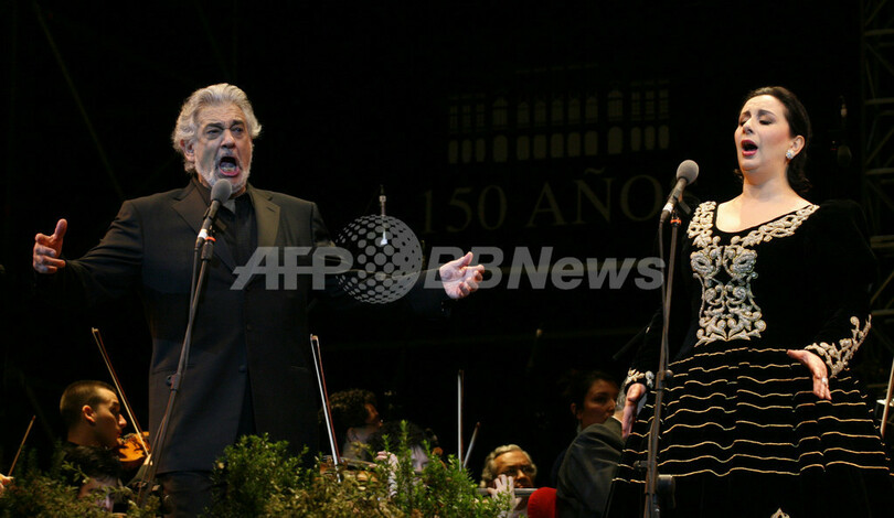 【サンティアゴ/チリ 12日 AFP】Town Council Theatreの新シーズン開幕を記念して11日、Plaza de Armasを会場に、スペイン人テノール歌手のプラシド・ドミンゴ(Placido Domingo)とチリ人ソプラノ歌手ヴェロニカ・ヴィッラロエル(Veronica Villarroel)がオープニング・コンサートを開催した。写真は壇上でパフォーマンスを披露するドミンゴ(左)とヴィッラロエル。(c)AFP/DAVID LILLO