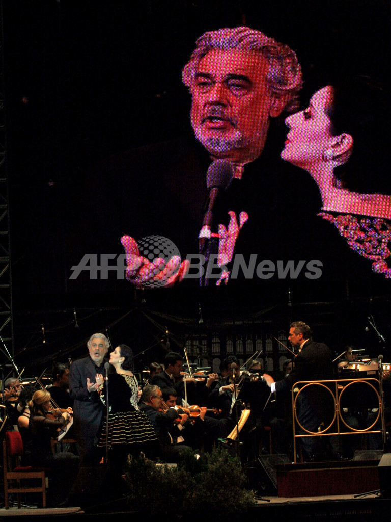 【サンティアゴ/チリ 12日 AFP】Town Council Theatreの新シーズン開幕を記念して11日、Plaza de Armasを会場に、スペイン人テノール歌手のプラシド・ドミンゴ(Placido Domingo)とチリ人ソプラノ歌手ヴェロニカ・ヴィッラロエル(Veronica Villarroel)がオープニング・コンサートを開催した。写真は壇上でパフォーマンスを披露するドミンゴ(左)とヴィッラロエル。(c)AFP/DAVID LILLO