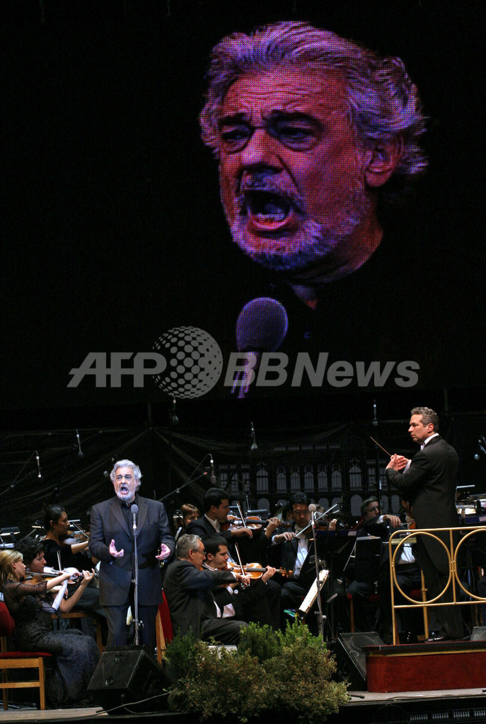 【サンティアゴ/チリ 12日 AFP】Town Council Theatreの新シーズン開幕を記念して11日、Plaza de Armasを会場に、スペイン人テノール歌手のプラシド・ドミンゴ(Placido Domingo)とチリ人ソプラノ歌手ヴェロニカ・ヴィッラロエル(Veronica Villarroel)がオープニング・コンサートを開催した。写真は壇上でパフォーマンスを披露するドミンゴ(左)とヴィッラロエル。(c)AFP/DAVID LILLO