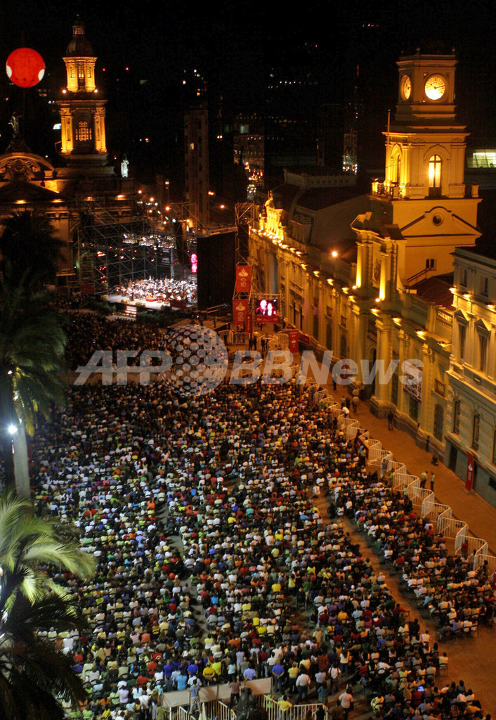 【サンティアゴ/チリ 12日 AFP】Town Council Theatreの新シーズン開幕を記念して11日、Plaza de Armasを会場に、スペイン人テノール歌手のプラシド・ドミンゴ(Placido Domingo)とチリ人ソプラノ歌手ヴェロニカ・ヴィッラロエル(Veronica Villarroel)がオープニング・コンサートを開催した。写真は壇上でパフォーマンスを披露するドミンゴ(左)とヴィッラロエル。(c)AFP/DAVID LILLO