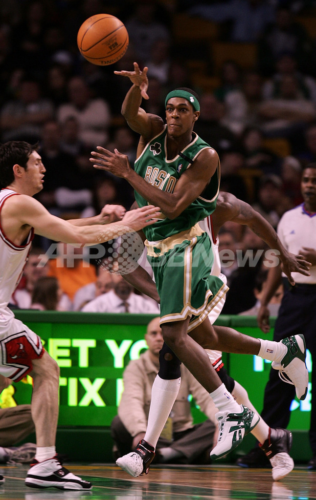 【ボストン/米国 11日 AFP】06-07NBA、ボストン・セルティックス(Boston Celtics)vsシカゴ・ブルズ(Chicago Bulls)。ブルズのカーク・ハインリック(Kirk Hinrich)は、チーム最多の26得点7アシスト3スティールと攻守に渡る活躍を見せ、チームの勝利に貢献した。試合は最大17点のリードを奪うなどシュートを着実に成功させて試合の主導権を握ったブルズが94-78でセルティックスを破り、連勝で今季37勝目を挙げた。写真は、セルティックスのローハン・ロンド(Rajon Rondo)からのチェックを受けるハインリック。(c)AFP/Getty Images Elsa