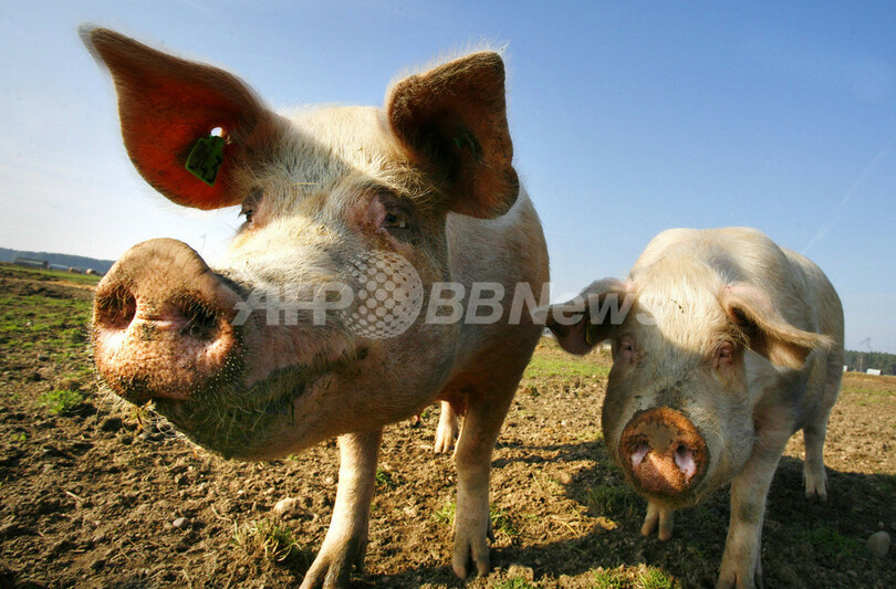 【Goemnik/ドイツ 12日 AFP】ドイツで有機農業を営むBernd Schulzさんがこのほど、ロシアの農業専門家らと契約を結び、同国内でオーガニック・ブタの飼育プロジェクトを手がけることになった。Schulzさんはベルリンで開催された「国際緑の週間(Gruene Woche)」で今回の契約を締結。モスクワの南方300キロメートル付近で5月より、最初は雄ブタ6頭、雌ブタ70頭でプロジェクトを開始する。写真は12日、ドイツ東部のGoemnikで撮影されたSchulzさんの農場のブタ。(c)AFP/DDP/MICHAEL URBAN