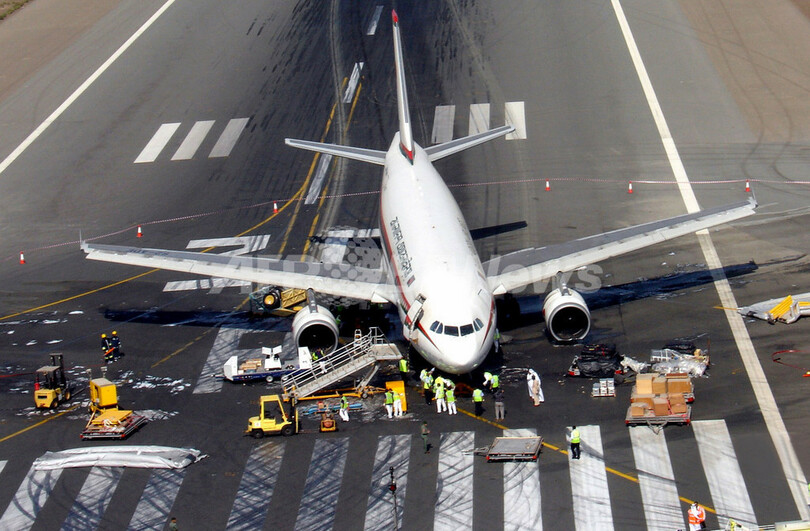 【ドバイ/UAE 12日 AFP】ドバイ(Dubai)国際空港で12日、離陸しようとしたビーマン・バングラデシュ航空(Bangladesh Airlines)機が故障し、15人以上が負傷した。ドバイの航空当局によると、同機には乗員乗客236人が搭乗し、バングラデシュの首都ダッカ(Dhaka)へ向かう予定だった。空港は事故の影響で7時間半にわたり閉鎖された後、再開されている。写真は同日、ドバイ国際空港で事故を起こした航空機。(c)AFP