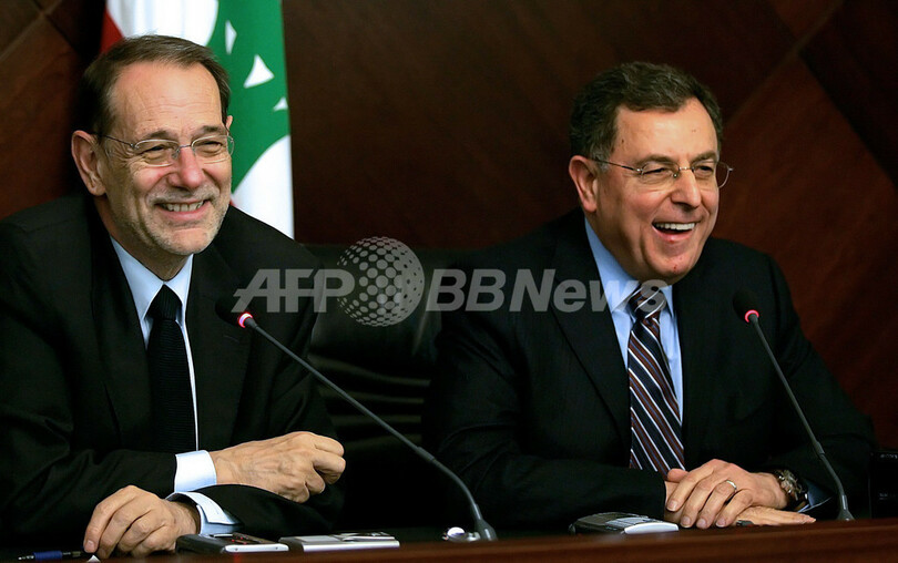 【ベイルート/レバノン 13日 AFP】中東を歴訪中の欧州連合(EU)のハビエル・ソラナ(Javier Solana)共通外交・安全保障上級代表は12日、ベイルート(Beirut)でフアド・シニオラ(Fuad Siniora)首相と会談した。ソラナ上級代表はこの後、レバノンの政治的行き詰まりの打開に向け、シリアを訪問する予定。今月後半にサウジアラビアで開催が予定されているアラブ諸国による首脳会議を控え、ソラナ上級代表は今回の中東歴訪を非常に重視している。写真は同日、ベイルートで記者会見するソラナ上級代表とシニオラ首相(右)。(c)AFP/JOSEPH BARRAK