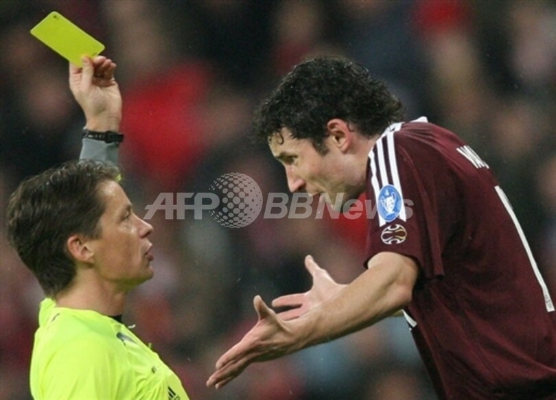 写真は、レアル・マドリードとの第2戦でイエローカードを提示され抗議するファン・ボメル(2007年3月7日撮影)。(c)AFP/DDP/OLIVER LANG