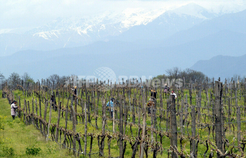 写真はTelaviのブドウ畑で収穫する人々(2006年4月14日撮影)。(c)AFP/VANO SHLAMOV