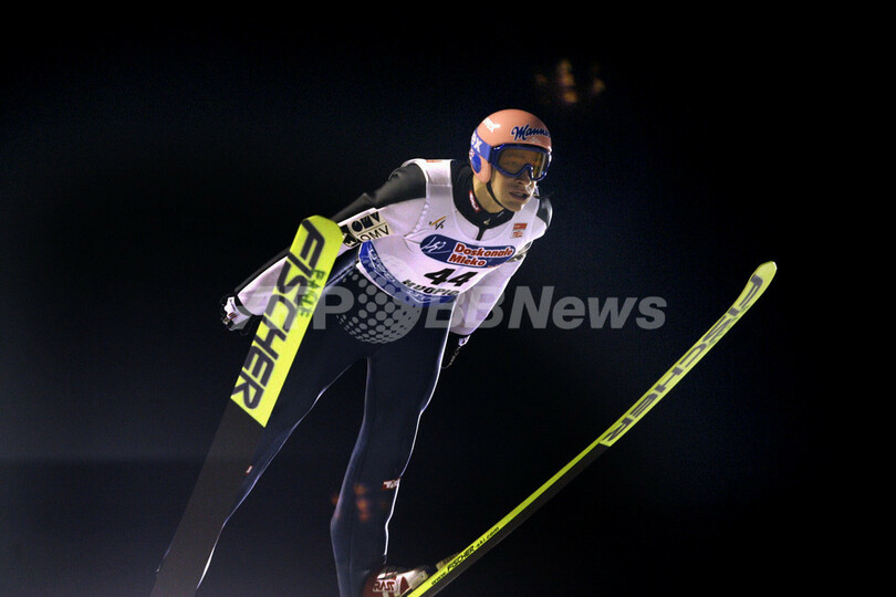 【クオピオ/フィンランド 13日 AFP】ノルディックスキー・ジャンプW杯(FIS WORLD SKI JUMPING 2006/07)・第26戦・個人ラージヒル。ポーランドのアダム・マリシュ(Adam Malysz)は、1本目125.0メートル、2本目115.0メートルをマークし、2本合計229.0ポイントを獲得して今季5勝目を挙げた。また、2位には合計227.3ポイントでオーストリアのアンドレアス・コフラー(Andreas Kofler)が、3位には合計217.7ポイントでオーストリアのトーマス・モルゲンシュテルン(Thomas Morgenstern)が入った。写真は、表彰台で喜びを表す(左から)コフラー、マリシュ、モルゲンシュテルン。(c)AFP/Martti Kainulainen