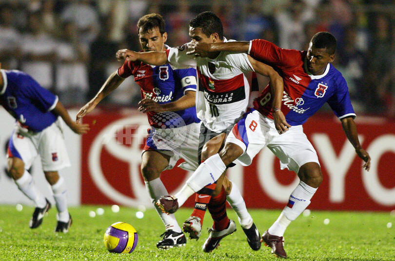 【クリチバ/ブラジル 14日 AFP】サッカー、リベルタドーレス杯南米選手権2007(Copa Libertadores de America 2007)・第2ラウンド、グループ5・第3節、パラナ(Parana、ブラジル)vsフラメンゴ(Clube de Regatas do Flamengo、ブラジル)。試合はフラメンゴが1-0で勝利し、通算成績を2勝1分けとした。写真は、パラナのジョエウソン(Joelson、左)とベト(Beto)をかわすフラメンゴのレナト・アウグスト(Renato Augusto、中央)。(c)AFP/ORLANDO KISSNER