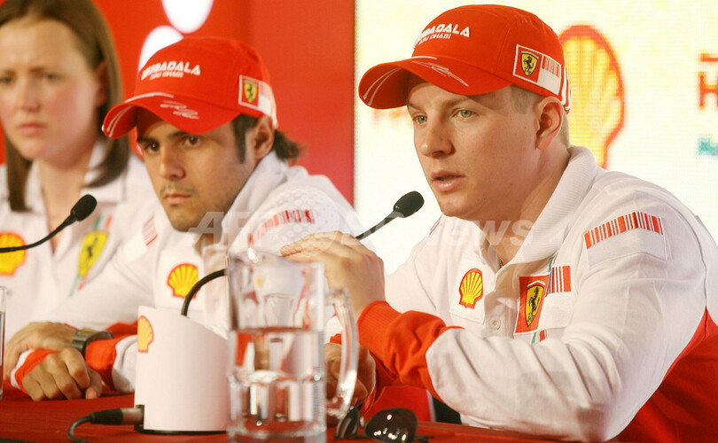 写真は、会見に臨むマッサ(中央)とライコネン(右)。(c)AFP/William WEST