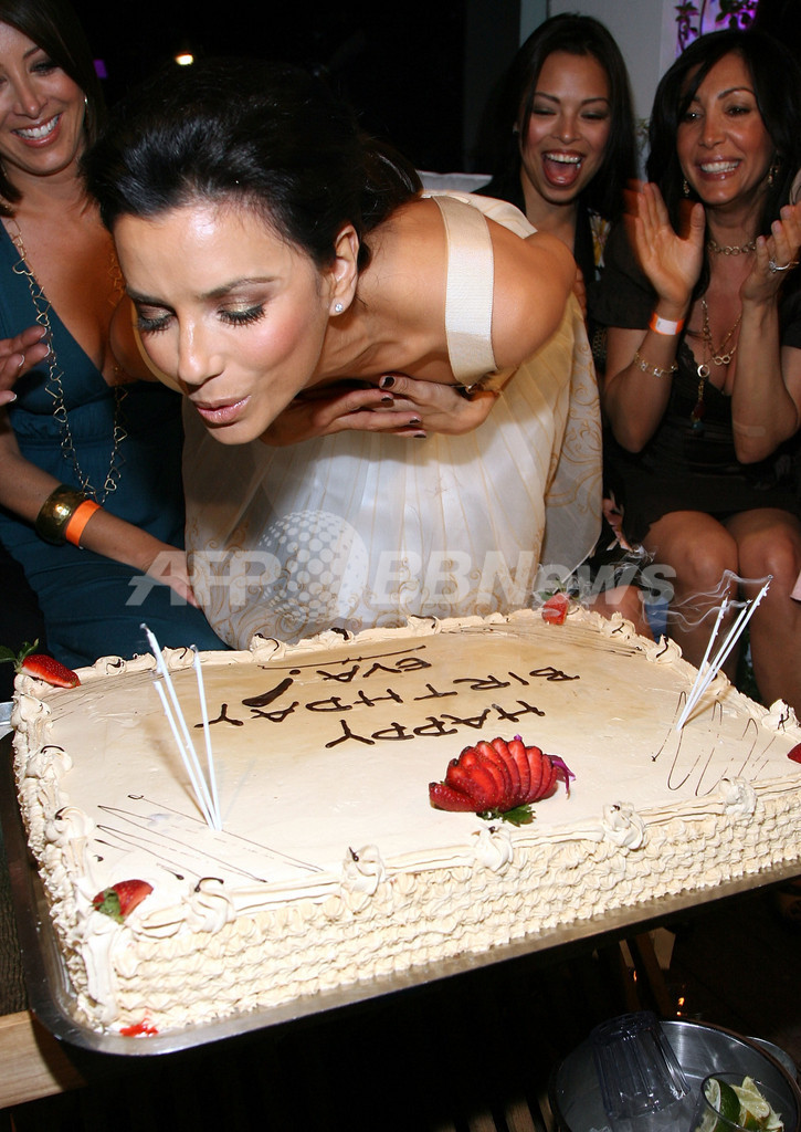 【ロサンゼルス/米国 15日 AFP】ファッションブランド「Bebe Sport」主催の、女優のエバ・ロンゴリア(Eva Longoria)の誕生日パーティーが14日、モンドリアン・ホテル(Mondrian Hotel)のスカイバー(SkyBar)で開催され、著名人らが多数参加した。写真は、バースデーケーキのキャンドルを吹き消すエバ・ロンゴリア。(c)AFP/Getty Images Frazer Harrison