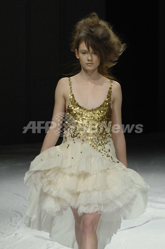 【東京 16日 AFP BB News】12日から第4回「東京発 日本ファッション・ウィーク(JAPAN FASHION WEEK)が開催されている。5日間にわたり、日本橋の特設テントや東京ビル内の会場を舞台に38ブランドが07/08年秋冬コレクションを発表する。15日、スズキ タカユキ(suzuki takayuki)が新作を発表した。写真は、新作を披露するモデル。(c)AFP BB News/HIROKAZU OHARA