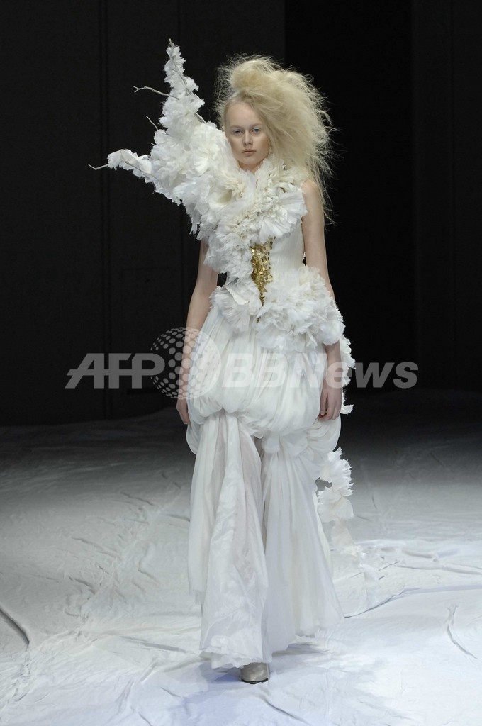 【東京 16日 AFP BB News】12日から第4回「東京発 日本ファッション・ウィーク(JAPAN FASHION WEEK)が開催されている。5日間にわたり、日本橋の特設テントや東京ビル内の会場を舞台に38ブランドが07/08年秋冬コレクションを発表する。15日、スズキ タカユキ(suzuki takayuki)が新作を発表した。写真は、新作を披露するモデル。(c)AFP BB News/HIROKAZU OHARA