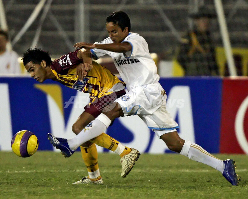 【イバゲ/コロンビア 15日 AFP】サッカー、リベルタドーレス杯南米選手権2007(Copa Libertadores de America 2007)・第2ラウンド、グループ3・第3節、デポルテス・トリマ(Deportes Tolima、コロンビア)vsグレミオ(Gremio、ブラジル)。試合は1-0でデポルテス・トリマが勝利し、2勝目を挙げた。写真は、グレミオのエヴェルトン(Everton)とボールを争うイラリオ・クエヌ(Hilario Cuenu)(c)AFP/Mauricio DUENAS