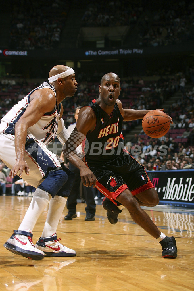 【イーストラザフォード/米国 15日 AFP】06-07NBA、ニュージャージー・ネッツ(New Jersey Nets)vsマイアミ・ヒート(Miami Heat)。ヒートのジェイソン・ウィリアムス(Jason Williams)は、13得点12アシストでダブルダブルを記録しチームの勝利に貢献。試合はヒートが93-86でネッツに勝利し、8連勝を飾った。写真は、ドリブルからレイアップシュートを放つウィリアムス。(c)AFP/Getty Images/NBAE Jesse D. Garrabrant
