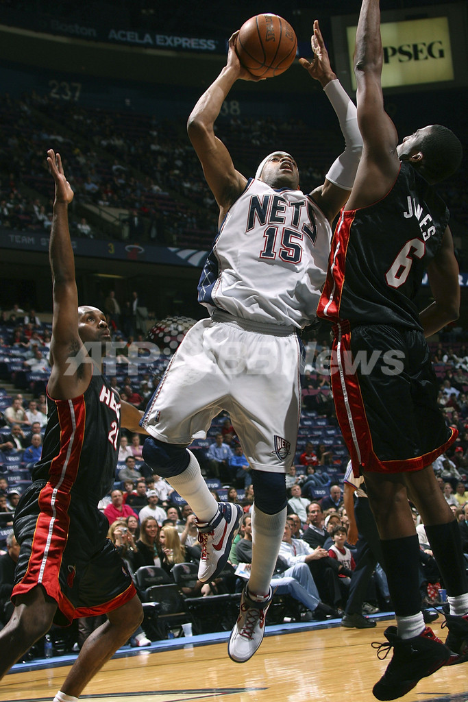 【イーストラザフォード/米国 15日 AFP】06-07NBA、ニュージャージー・ネッツ(New Jersey Nets)vsマイアミ・ヒート(Miami Heat)。ヒートのジェイソン・ウィリアムス(Jason Williams)は、13得点12アシストでダブルダブルを記録しチームの勝利に貢献。試合はヒートが93-86でネッツに勝利し、8連勝を飾った。写真は、ドリブルからレイアップシュートを放つウィリアムス。(c)AFP/Getty Images/NBAE Jesse D. Garrabrant