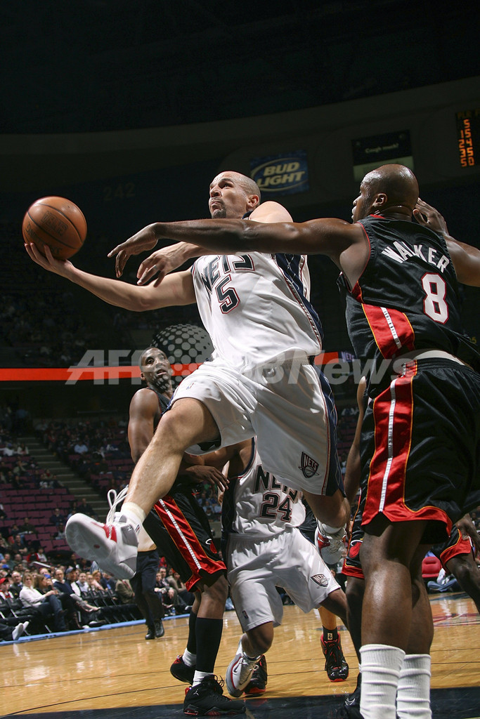 【イーストラザフォード/米国 15日 AFP】06-07NBA、ニュージャージー・ネッツ(New Jersey Nets)vsマイアミ・ヒート(Miami Heat)。ヒートのジェイソン・ウィリアムス(Jason Williams)は、13得点12アシストでダブルダブルを記録しチームの勝利に貢献。試合はヒートが93-86でネッツに勝利し、8連勝を飾った。写真は、ドリブルからレイアップシュートを放つウィリアムス。(c)AFP/Getty Images/NBAE Jesse D. Garrabrant