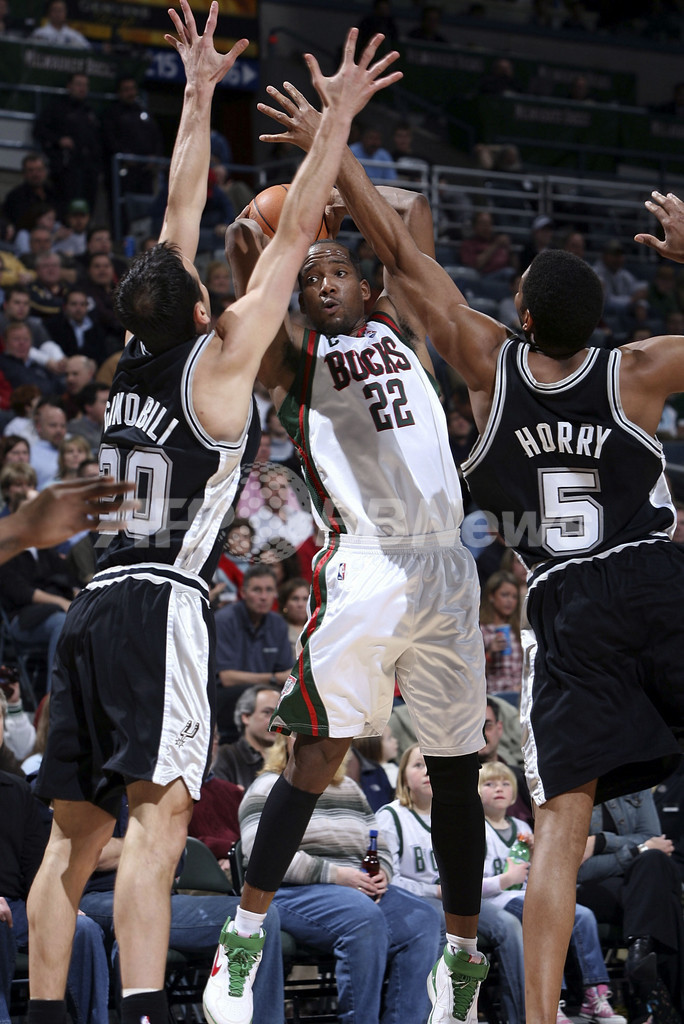 【ミルウォーキー/米国 15日 AFP】06-07NBA、ミルウォーキー・バックス(Milwaukee Bucks)vsサンアントニオ・スパーズ(San Antonio Spurs)。バックスのマイケル・レッド(Michael Redd、左2)は、ゲームハイとなる29得点を挙げる活躍でチームの勝利に貢献。試合はバックスが101-90でスパーズに勝利し、今季24勝目を挙げた。写真は、スパーズのロバート・オーリー(Robert Horry、右)、エマニュエル・ジノビリ(Emanuel Ginobili、左)のブロックをかわしてシュートを放つレッド。(c)AFP/Getty Images/NBAE Gary Dineen