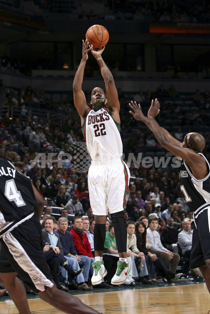 【ミルウォーキー/米国 15日 AFP】06-07NBA、ミルウォーキー・バックス(Milwaukee Bucks)vsサンアントニオ・スパーズ(San Antonio Spurs)。バックスのマイケル・レッド(Michael Redd、左2)は、ゲームハイとなる29得点を挙げる活躍でチームの勝利に貢献。試合はバックスが101-90でスパーズに勝利し、今季24勝目を挙げた。写真は、スパーズのロバート・オーリー(Robert Horry、右)、エマニュエル・ジノビリ(Emanuel Ginobili、左)のブロックをかわしてシュートを放つレッド。(c)AFP/Getty Images/NBAE Gary Dineen