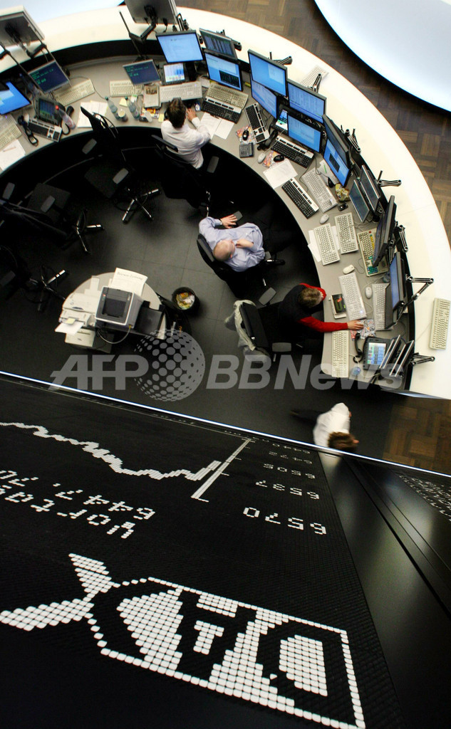 写真は15日、フランクフルト株式市場の取引の様子。(c)AFP/DDP/THOMAS LOHNES