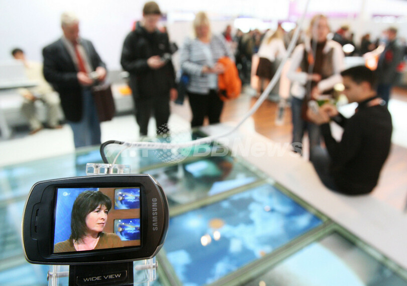 写真は16日、CeBITに設けられたドイツ第2テレビ(ZDF)のブースで、携帯電話を利用してテレビ番組を見る人々。(c)AFP/JOHN MACDOUGALL