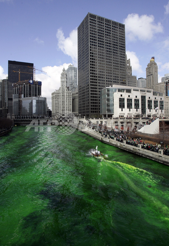 【シカゴ/米国 18日 AFP】米国、アイルランドを始め世界中で17日、数百万人の人々が聖パトリックデーを祝福し、パレードや華やかなお祭りを催した。アイルランドでは、その守護聖人を祝福するこの日に、昔から黒ビールなどの酒が飲まれ、観光シーズンを前に盛り上がる。写真は同日、イリノイ(Illinois)州シカゴ(Chicago)で、シカゴ川(Chicago River)をアイルランドを象徴する緑色に染めるボート。(c)AFP/JEFF HAYNES