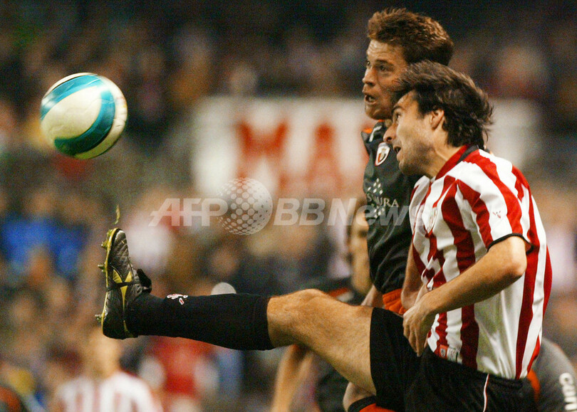 【ビルバオ/スペイン 17日 AFP】サッカー、スペイン・リーガエスパニョーラ1部・第27節、アスレティック・ビルバオ(Athletic Bilbao)vsオサスナ(Osasuna)。試合は0-3でオサスナが快勝しリーグ10勝目を挙げた。写真は、アスレティック・ビルバオのフェルナンド・アモレビエタ(Fernando Amorebieta)にタックルを仕掛けるオサスナのダビド・ロペス(David Lopez、左)。(c)AFP/RAFA RIVAS