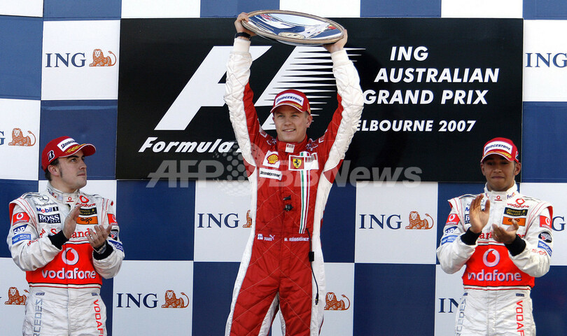 【メルボルン/オーストラリア 18日 AFP】F1・2007年シーズン開幕戦・オーストラリアGP(Australian Grand Prix 2007)・決勝。ポールポジションからスタートしたフェラーリ(Ferrari)のキミ・ライコネン(Kimi Raikkonen)は、2位に入ったマクラーレン・メルセデス(McLaren-Mercedes)のフェルナンド・アロンソ(Fernando Alonso)に7秒2差をつけて、シーズン開幕戦をポール・トゥ・ウィンで飾った。写真は、表彰台で授与されたトロフィーを高々と掲げるライコネン。(c)AFP/Torsten BLACKWOOD