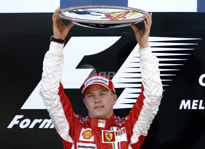 【メルボルン/オーストラリア 18日 AFP】F1・2007年シーズン開幕戦・オーストラリアGP(Australian Grand Prix 2007)・決勝。ポールポジションからスタートしたフェラーリ(Ferrari)のキミ・ライコネン(Kimi Raikkonen)は、2位に入ったマクラーレン・メルセデス(McLaren-Mercedes)のフェルナンド・アロンソ(Fernando Alonso)に7秒2差をつけて、シーズン開幕戦をポール・トゥ・ウィンで飾った。写真は、表彰台で授与されたトロフィーを高々と掲げるライコネン。(c)AFP/Torsten BLACKWOOD