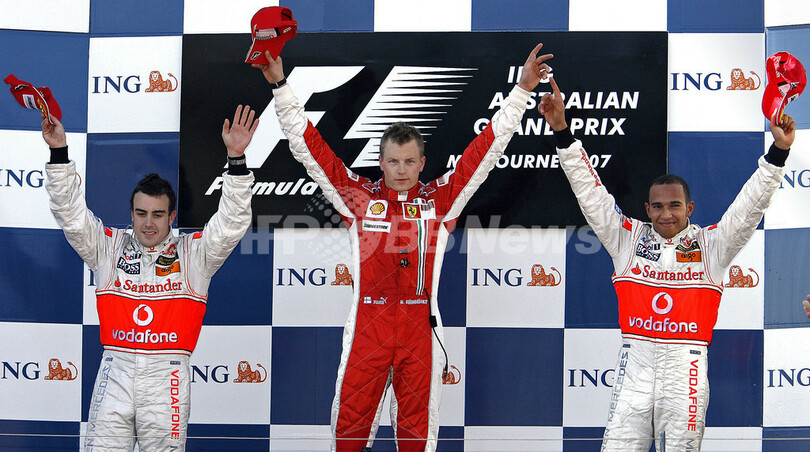 【メルボルン/オーストラリア 18日 AFP】F1・2007年シーズン開幕戦・オーストラリアGP(Australian Grand Prix 2007)・決勝。ポールポジションからスタートしたフェラーリ(Ferrari)のキミ・ライコネン(Kimi Raikkonen)は、2位に入ったマクラーレン・メルセデス(McLaren-Mercedes)のフェルナンド・アロンソ(Fernando Alonso)に7秒2差をつけて、シーズン開幕戦をポール・トゥ・ウィンで飾った。写真は、表彰台で授与されたトロフィーを高々と掲げるライコネン。(c)AFP/Torsten BLACKWOOD