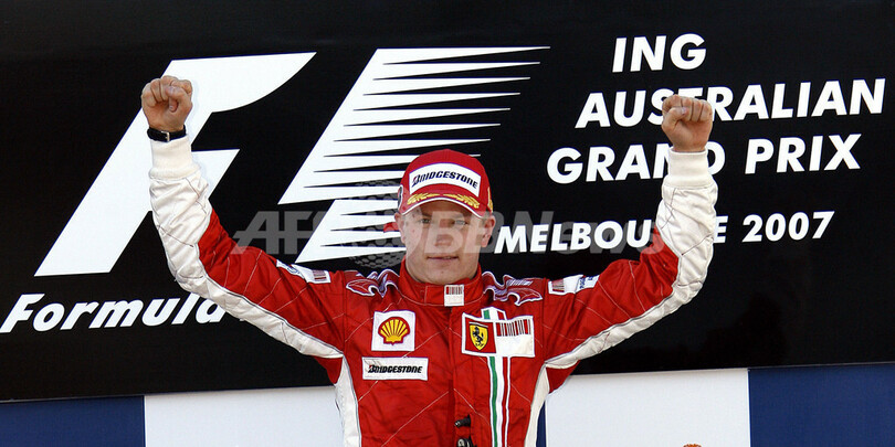 【メルボルン/オーストラリア 18日 AFP】F1・2007年シーズン開幕戦・オーストラリアGP(Australian Grand Prix 2007)・決勝。ポールポジションからスタートしたフェラーリ(Ferrari)のキミ・ライコネン(Kimi Raikkonen)は、2位に入ったマクラーレン・メルセデス(McLaren-Mercedes)のフェルナンド・アロンソ(Fernando Alonso)に7秒2差をつけて、シーズン開幕戦をポール・トゥ・ウィンで飾った。写真は、表彰台で授与されたトロフィーを高々と掲げるライコネン。(c)AFP/Torsten BLACKWOOD