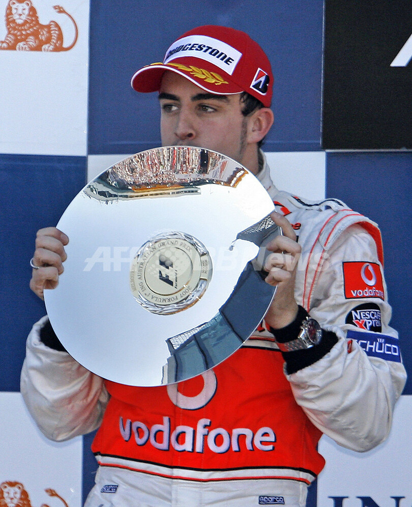 【メルボルン/オーストラリア 18日 AFP】F1・2007年シーズン開幕戦・オーストラリアGP(Australian Grand Prix 2007)・決勝。ポールポジションからスタートしたフェラーリ(Ferrari)のキミ・ライコネン(Kimi Raikkonen)は、2位に入ったマクラーレン・メルセデス(McLaren-Mercedes)のフェルナンド・アロンソ(Fernando Alonso)に7秒2差をつけて、シーズン開幕戦をポール・トゥ・ウィンで飾った。写真は、表彰台で授与されたトロフィーを高々と掲げるライコネン。(c)AFP/Torsten BLACKWOOD