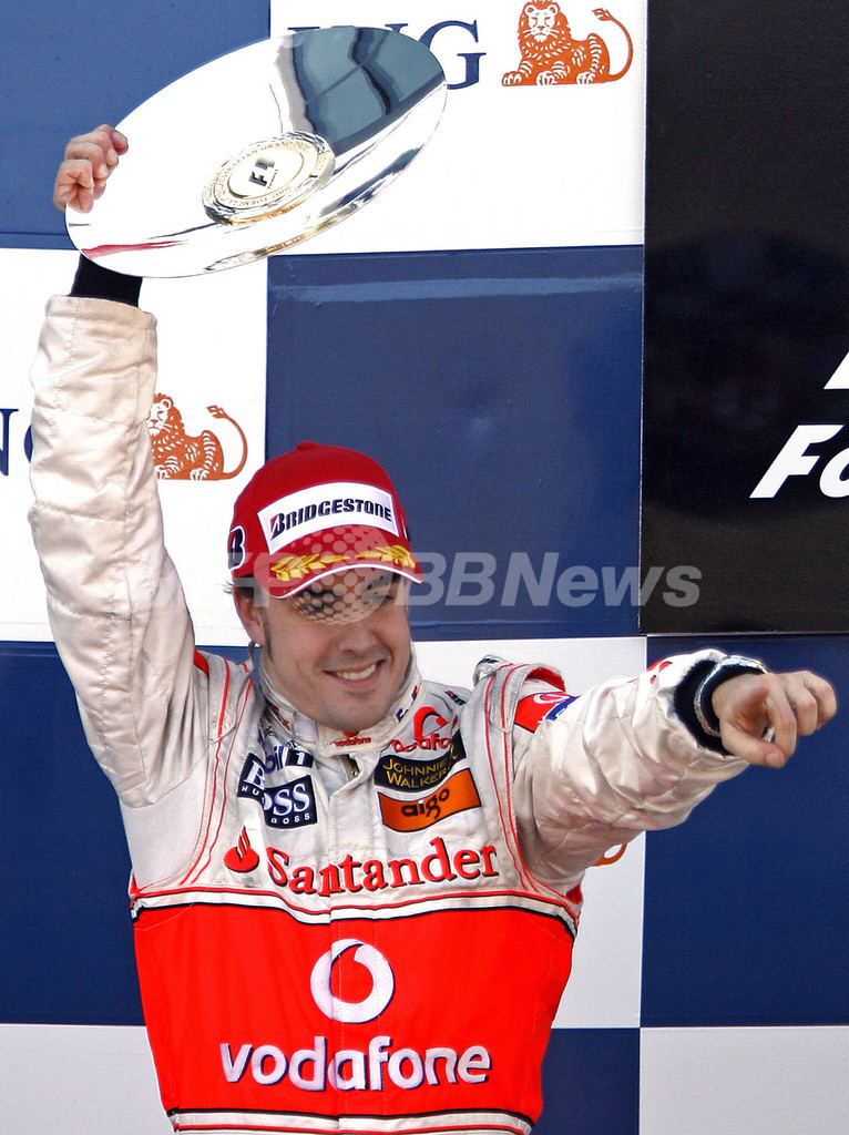 【メルボルン/オーストラリア 18日 AFP】F1・2007年シーズン開幕戦・オーストラリアGP(Australian Grand Prix 2007)・決勝。ポールポジションからスタートしたフェラーリ(Ferrari)のキミ・ライコネン(Kimi Raikkonen)は、2位に入ったマクラーレン・メルセデス(McLaren-Mercedes)のフェルナンド・アロンソ(Fernando Alonso)に7秒2差をつけて、シーズン開幕戦をポール・トゥ・ウィンで飾った。写真は、表彰台で授与されたトロフィーを高々と掲げるライコネン。(c)AFP/Torsten BLACKWOOD