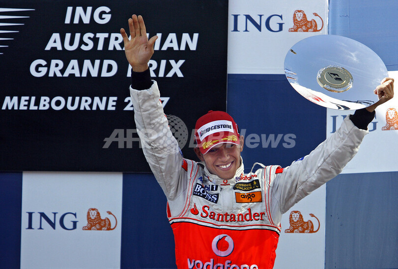 【メルボルン/オーストラリア 18日 AFP】F1・2007年シーズン開幕戦・オーストラリアGP(Australian Grand Prix 2007)・決勝。ポールポジションからスタートしたフェラーリ(Ferrari)のキミ・ライコネン(Kimi Raikkonen)は、2位に入ったマクラーレン・メルセデス(McLaren-Mercedes)のフェルナンド・アロンソ(Fernando Alonso)に7秒2差をつけて、シーズン開幕戦をポール・トゥ・ウィンで飾った。写真は、表彰台で授与されたトロフィーを高々と掲げるライコネン。(c)AFP/Torsten BLACKWOOD